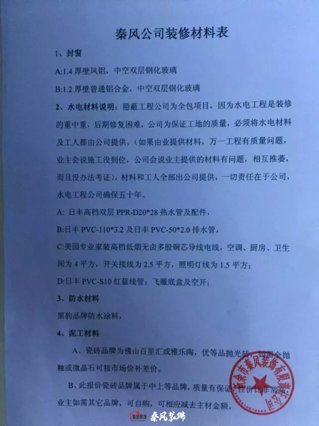 秦風(fēng)公司裝修材料配置,最近太多人問了,于是決定發(fā)出來,材料明朗,不搞虛假,只要我們用的材料不符,業(yè)主可以不付款,我公司可是“先裝修后付款,售后終身,隱蔽工程質(zhì)保50年”,我們沒有樣板房,每套房子都是樣板房,隨時(shí)參觀,隨時(shí)檢查。