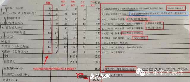 一般施工隊(duì)在每項(xiàng)報(bào)價(jià)后面會(huì)注明是用什么材料及施工工藝,比如墻面漆30元/平方米,應(yīng)注明對(duì)于墻面基層的處理工藝,如刮幾遍膩?zhàn)诱移剑槟z漆的品牌型號(hào)及涂刷工藝,如刷前加一遍底漆及乳膠漆加水的百分比和滾涂遍數(shù)等。還有一些額外的預(yù)算,報(bào)價(jià)的時(shí)候一定要提前告知業(yè)主,比如墻面底基找平處理,地面找平等,還有瓷磚規(guī)格過大或過小,都要加錢的,這些收費(fèi)項(xiàng)目施工方都應(yīng)提前告知業(yè)主或者有備注說明,如果在預(yù)算中不寫上,到現(xiàn)場(chǎng)施工時(shí)才提出來,面對(duì)突然多出來的費(fèi)用,一般業(yè)主會(huì)難以接受。