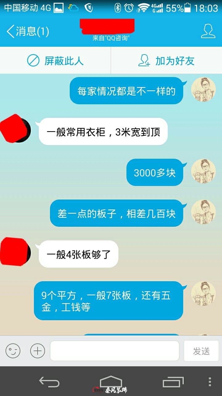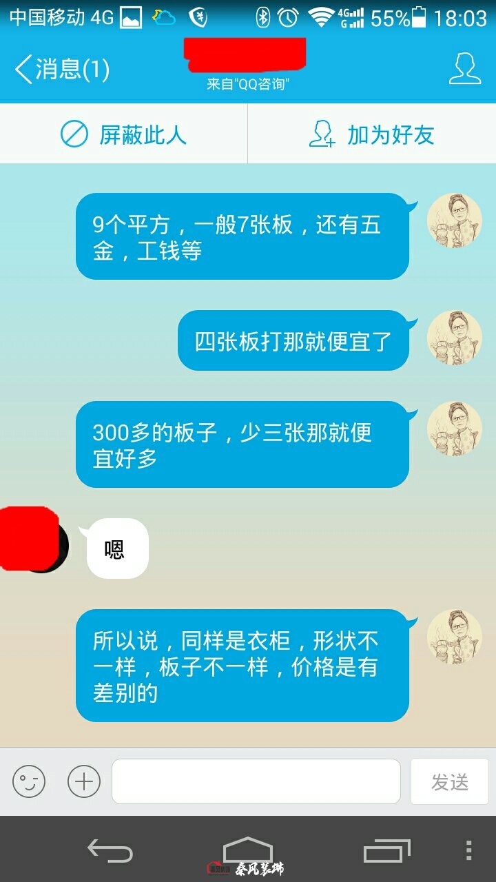 我說(shuō):我們是用七張板做的,(3000多是用千年舟或莫干山E1級(jí)的板子[差板子相差幾百塊錢(qián)],用七張板做,衣柜內(nèi)在結(jié)構(gòu)相對(duì)合理復(fù)雜。四張板也可以做,就是有其外形,而內(nèi)在結(jié)構(gòu)簡(jiǎn)單,再加上工錢(qián)和衣柜五金、柜門(mén),差不多就是3000來(lái)塊錢(qián))。